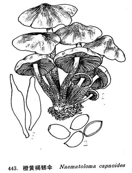 图 443 橙黄褐韧伞 : 1.子实体, 2.孢子, 3.褶侧及褶缘囊体