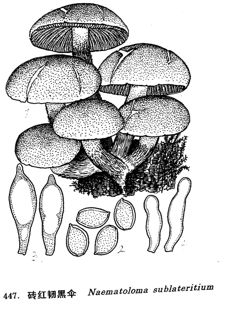 图 447 砖红韧黑伞 : 1. 子实体, 2. 孢子, 3. 囊体