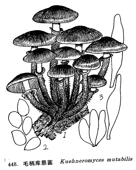 图 448 毛柄库恩菌 : 1. 子实体, 2. 孢子, 3. 褶缘囊体