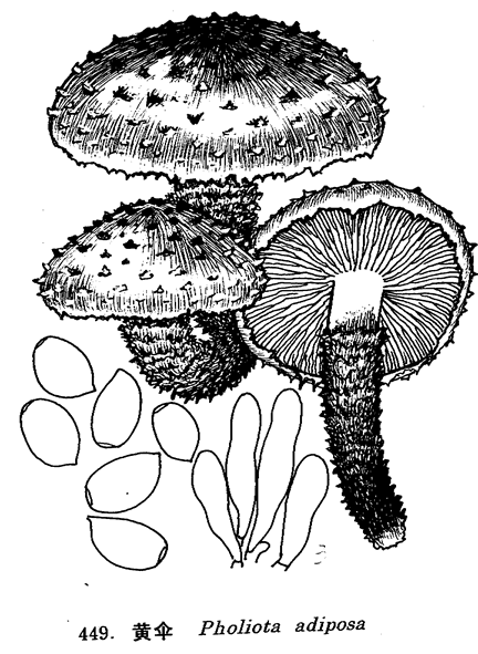 子实体一般中等大。菌盖直径 3-12cm,初扁半球形,边缘常内卷,后渐平展,很粘,谷黄色,污黄色至黄褐色,有褐色近平伏的鳞片,中央较密。菌肉白色或淡黄色。菌褶黄色至锈褐色,直生或近弯生,稍密,不等长。菌柄长5-15(20)cm,粗0.5-3cm,圆柱形,与菌盖同色,有褐色反卷的鳞片,粘或稍粘,下部常弯曲,纤维质,内实。菌环淡黄色,膜质,生柄之上部,易脱落。孢子锈色,椭圆形或长椭圆形,平滑,7.5-9.5μm×5-6.3μm。褶侧囊体无色或淡褐色,棒状,不突越子实层,30-42μm×6.3-7.5μm。