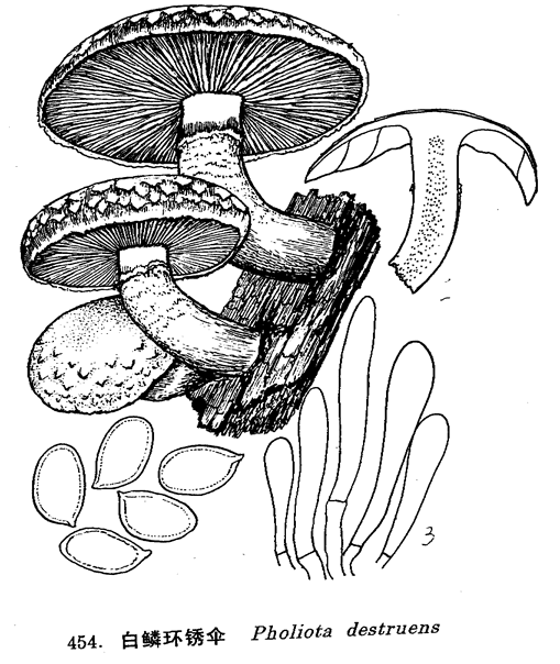 图 454 白鳞环锈伞 : 1. 子实体, 2. 孢子, 3. 褶缘囊体