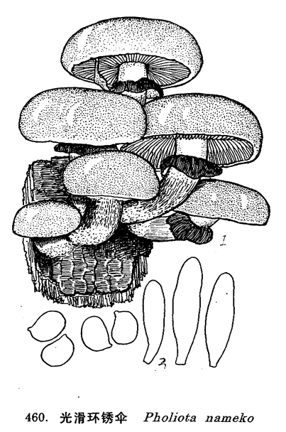 图 460 光滑环锈伞 : 1.子实体,2.孢子,3.褶缘囊体