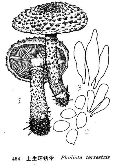 子实体小。菌盖直径3-6cm,扁球形至近平展,表面淡黄褐色,褐色至暗褐色。菌肉带黄色。菌褐直生,密,不等长,淡黄至黄褐色。往往菌盖的菌丛毛状鳞片色深。菌柄长3.5-7cm,粗0.3-0.8cm,色较盖色浅,中上部被绵毛状鳞片,且有菌环,下部似条纹或纤毛状鳞片,内部松软至空心。褶侧囊体,近棒状,纺锤状,黄色、金黄至锈黄色,38-40μm×7.6-10.2μm。孢子带黄色、光滑、壁厚,椭圆形至近卵圆形,5(7.3)-7(10.2)μm×3-4(5.4)μm。图例