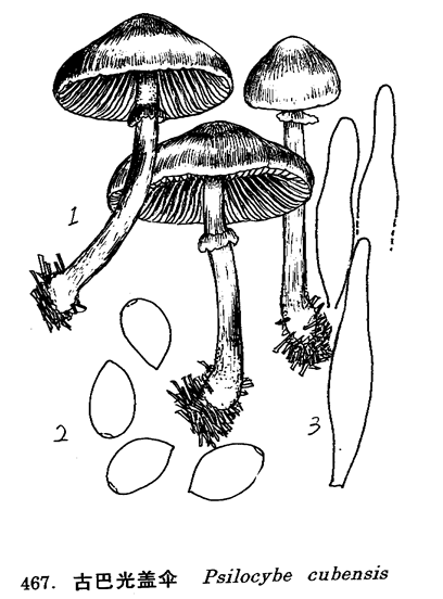 图 467 古巴光盖伞 : 1. 子实体, 2. 孢子, 3. 褶侧囊体