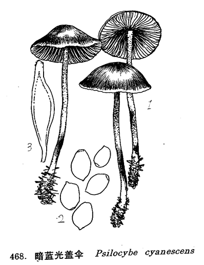 图 468 暗蓝光盖伞 : 1. 子实体, 2. 孢子, 3. 囊体