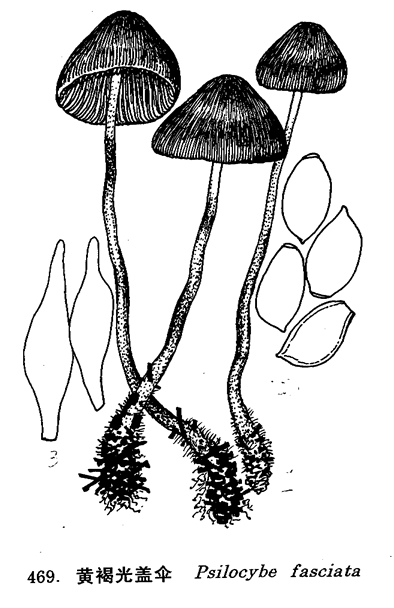子实体小。菌盖直径2-4cm,初期半球形,后呈扁半形至近钟形。中部宽的凸起,幼时边缘附着纤维状残幕,表面平滑,粘,灰褐色至浅黄褐色边缘色浅,干燥时灰白黄色,湿时边缘有细条纹。菌肉薄,污白色,受伤处变青蓝色。菌褶直生又弯生,不等长。较稀,稍宽,初期灰白色,后期灰褐至暗褐紫色,边缘近白色。菌柄圆柱形,细长,向下渐粗,长4-8cm,粗0.2-0.5cm,光滑,白色,上部粉状,伤处变青色。内部变空心,基部有白色粗绒毛。孢子印紫褐色。孢子光滑,椭圆形或卵圆形,一端平截,8.9-11.5μm×4.5-6μm。褶缘囊体近纺缍状,25-37μm×5.5-8μm。图例