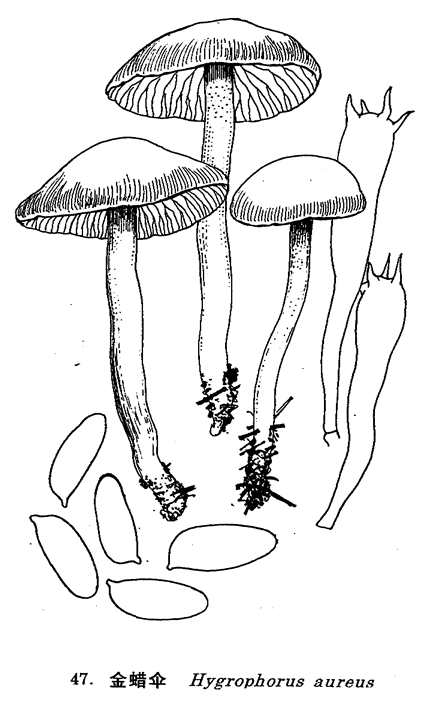 图 47 金蜡伞 : 1. 子实体, 2. 孢子, 3. 担子