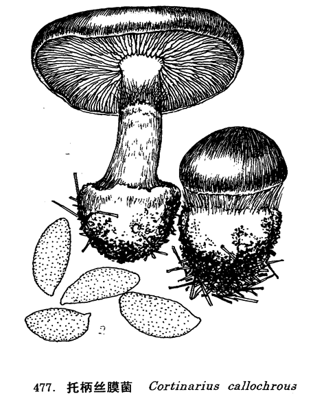 图 477 托柄丝膜菌 : 1. 子实体, 2. 孢子