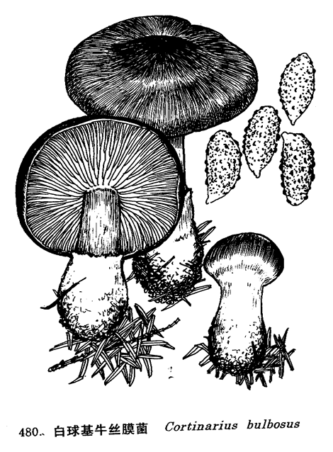 图 480 白球基牛丝膜菌 : 1. 子实体, 2. 孢子