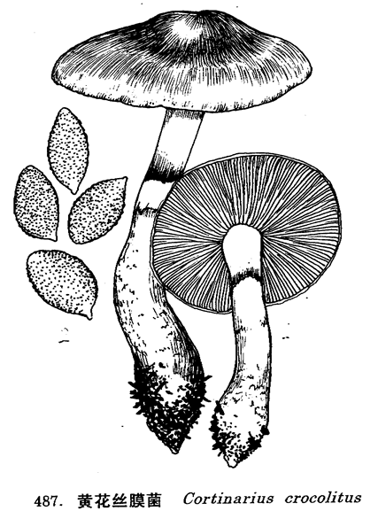 子实体中等至较大。菌盖直径4-12cm,初期半球形或扁半球形,后变扁平至近平展,中部平凸,表面近平滑,黄色而中央色较深呈土黄色,有不明显放射状条纹,边缘有浅黄色丝膜状物。菌肉较厚,白色带黄色,无明显气味。菌褶直生至近离生,较密,不等长,褐黄色带黄紫色,最后呈褐红色或锈红色。菌柄近柱形或弯曲,基部稍膨大并稍延伸,长7-8cm,粗1-2.5cm,浅黄白色,中下部有黄褐色纤毛状鳞片及丝膜的痕迹。孢子印锈色。孢子宽椭圆形且两端较小,10-13μm×5-7.5μm。图例