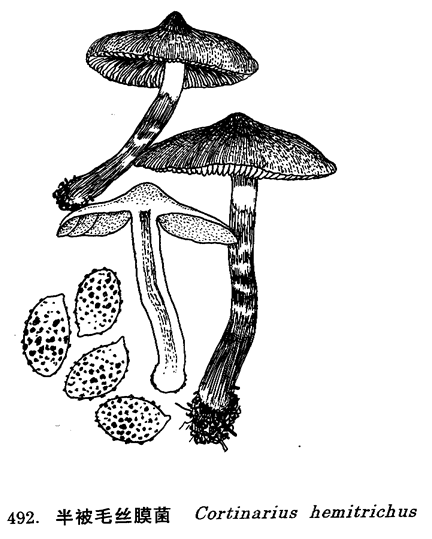 图 492 半被毛丝膜菌 : 1. 子实体, 2. 孢子