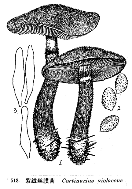 图 513 紫绒丝膜菌 : 1. 子实体, 2. 孢子, 3.褶缘和褶侧囊体