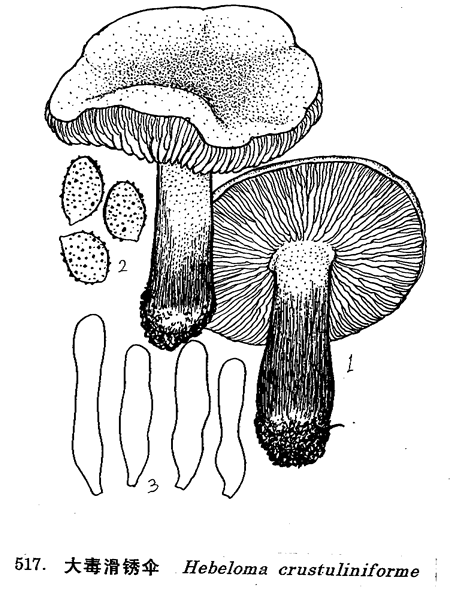 图 517 大毒滑锈伞 : 1. 子实体, 2. 孢子, 3. 囊体