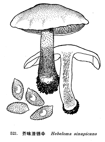 图 521 芥味滑锈伞 : 1. 子实体, 2. 孢子