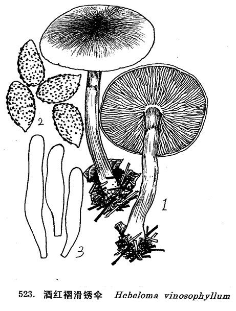 子实休小或近中等大。菌盖直径1.5-7cm,扁半球形, 后期近平展,表面平滑,粘,污白色,中部带土黄褐色,边缘有薄膜残物。菌肉白色,稍厚,有苦味。菌褶初期近白色,葡萄酒红色或浅红褐色,后期变暗褐锈色,直生至弯生,不等长,稍密。菌柄长3-7cm,粗0.3-0.6cm,圆柱形,细长,污白色至带土黄褐色,直立或稍弯曲,基部稍膨大或色浅,上部往往有蛛网状菌幕丝状物。褶侧囊体与褶缘囊体近纺锤状,顶部钝圆,无色,30-65μm×7-18μm。孢子近椭圆形,近粗糙,有小疣,8.8-12μm×5.6-7μm。图例