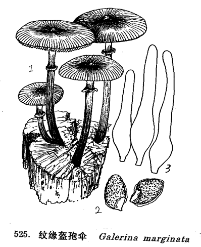 图 525 纹缘盔孢伞 : 1. 子实体, 2. 孢子, 3. 褶侧和褶缘囊体