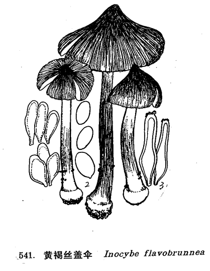 子实体较小。菌盖黄色至褐色,菌柄基部膨大呈杆状。菌盖直径cm,初期钟形,后呈斗笠形,表面具丝状纤毛,老后边缘开烈。菌肉污白色。菌褶浅褐色,较密,弯生,不等长。菌柄柱形,长6-14cm,粗0.4-0.8cm,污白色或浅褐色,脆,内部实心,表面具纤毛。孢子印锈色。孢子锈色至浅褐色,椭圆形,光滑,8-12μm×5-6μm,褶侧囊体瓶状,顶端钝园或有结晶,62-75μm×15-20μm。褶缘囊体近鸭梨形或纺锤状,椭圆形,25-50.6μm×8-15μm。图例