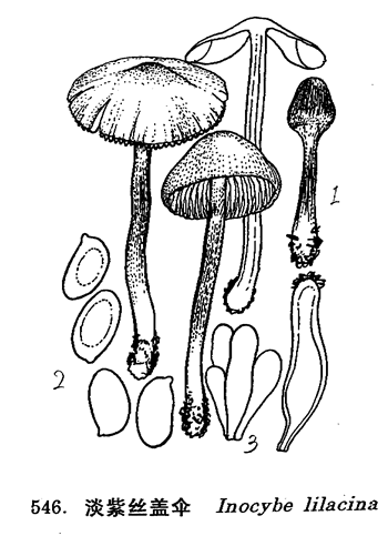 子实体小。淡紫色或淡紫褐色。菌盖幼时锥形或钟形,开伞后近平展,中部凸起,直径1.5-3.5cm,表面光滑或有丝状纤毛,淡紫色变紫褐色,顶部浅土黄色,边缘有不明显条棱。有时开裂。菌肉淡紫色。菌褶弯生,不等长。菌柄较细长,基部稍膨大,长4-6cm,粗0.2-0.5cm,扭转,质脆,表面污白至淡紫色,老后空心。菌柄上有丝膜而不成膜质菌环,菌褶紫变灰褐至褐锈色。孢子印锈色。孢子淡锈色,光滑。椭圆形或卵圆形或近肾形,8.5-11μm×5.5-7.5μm。褶缘囊体棍棒状至袋状,丛生一起,20-50μm×7-12μm。图例