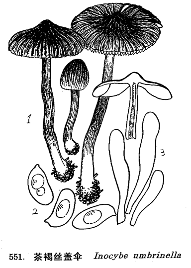 子实体较小。菌盖顶部茶褐色,边缘色浅。菌盖直径可达 5cm,初期钟形或斗笠形,后伸展中部凸起,表面有纤毛和放射状线条,往往边缘开裂。菌肉污白色。菌褶朽叶色,边缘污白色,密,弯生,不等长。菌柄圆柱形,长4.5-5.5cm,粗0.4-0.5cm,幼时污白色,后呈淡褐色,上部色浅,纤维质,表面有丝光,基部膨大。孢子印锈色。孢子淡黄褐色,椭圆形至卵圆形,壁较厚,7.5-12.7μm×5.8-7μm。褶缘囊体短棒状,50-73μm×10-15μm。图例