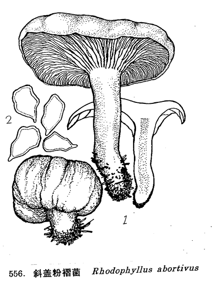 图 556 斜盖粉褶菌 : 1. 子实体, 2. 孢子