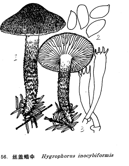 子实体一般较小。菌盖直径3.5-8.5cm,初期近圆锥形至扁半球形,边缘向内卷,后期近平展且中部突起,表面较干燥,灰褐色至深灰褐色,中部近黑褐色,有平伏的纤毛状鳞片及丝毛状条纹或裂纹,幼时盖边缘与菌柄间具有白色丝毛状菌幕。菌肉白色,伤不变色,中部较厚,无明显气味。菌褶白色或浅灰褐色,宽,直生至延生,不等长,较厚,蜡质。菌柄圆柱形,长3-10cm,粗0.5-1.5cm,向基部有时渐呈根状。菌环以上白色近光滑,其下有暗色纤毛状鳞片及花纹,实心。担子棒状,无色,45-65μm×10.8-12μm。孢子印白色。孢子椭圆形, 光滑,无色,9-14μm×5-7.8μm。图例