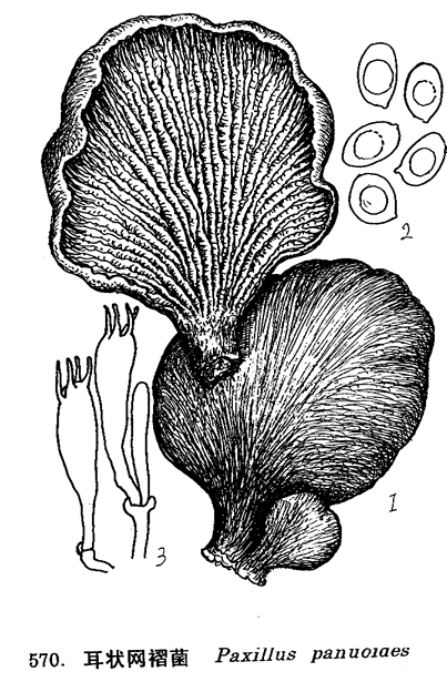 图 570 耳状网褶菌 : 1. 子实体, 2. 孢子, 3. 担子
