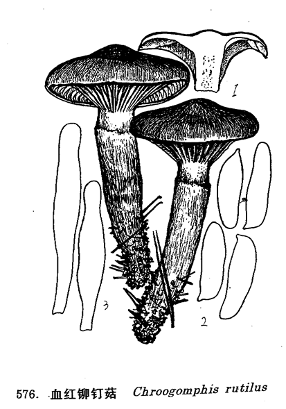 图 576 血红铆钉菇 : 1. 子实体, 2. 孢子,3. 褶缘囊体和褶侧囊体