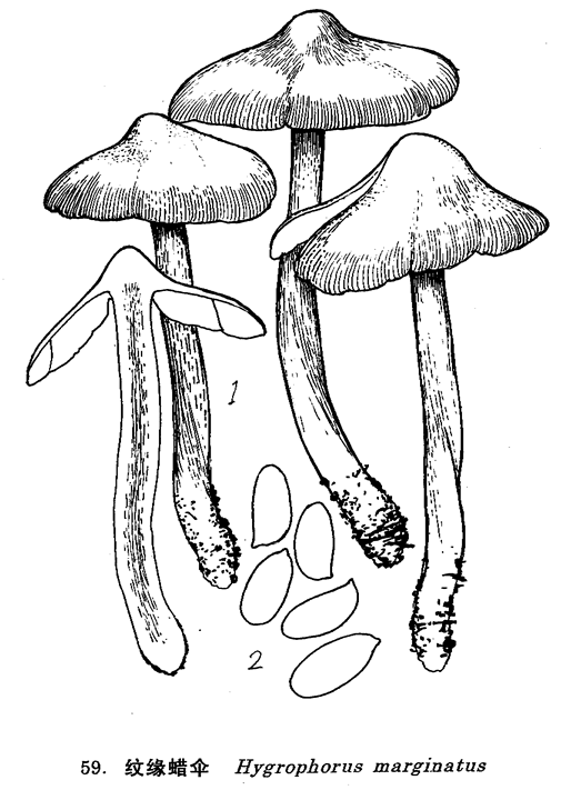 子实体较小。菌盖直径2-5cm,卵圆锥形,后期扁半球形且中部凸起,湿润,光滑无毛,偶尔有鳞片,黄色至橘黄色,边缘带橄榄色且有轻微条纹。菌肉薄,较盖色浅,受伤处不变黑色。菌褶橘黄色至黄色,不等长,直生至凹生,褶缘色暗,蜡质。菌柄长4-10cm,粗0.4-0.6cm,圆柱形或向基部渐膨大,光滑无毛,表面干。孢子印白色。孢子光滑,无色,椭圆形,7-9.1μm×3.9-5.5μm。担子细长达40-50μm。图例