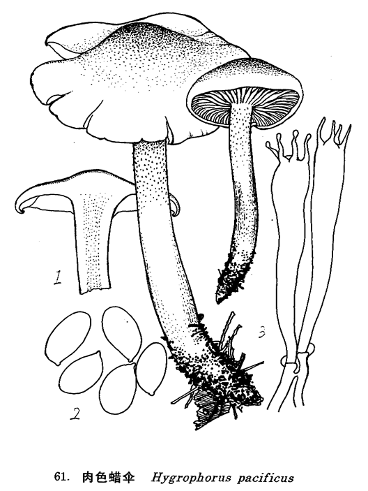 图 61 肉色蜡伞 : 1. 子实体, 2. 孢子, 3. 担子
