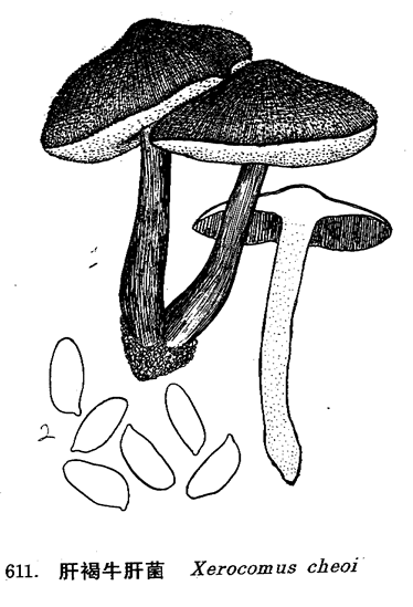 子实体小。菌盖直径1.5-5cm,半球形至扁平,中部略隆起,不粘,幼时肝褐色,后期玉桂红色,表面密被深褐色丝状鳞片。菌肉中部比较厚,污白色,受伤处变淡褐色或淡红色。菌管琥珀黄色或橙黄色,成熟后黄绿色。与菌柄直生至稍凹生,受伤处变蓝色。管长0.4-1.2cm,与管面同色。菌柄近柱形,长3-6cm,粗0.3-0.7cm,常向上渐细,基部可膨大,顶部蜜绯色或棕土褐色,表面光滑,内部实心。孢子椭圆形,棕色,8-11μm×4-5(9×5)μm。图例