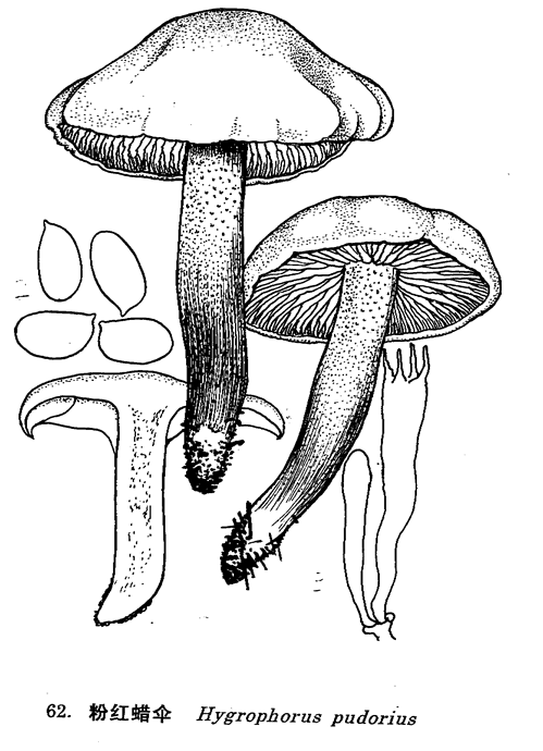 子实体一般中等大。菌盖直径5-10cm,半球形至扁半球形,后期近扁平,潮湿时粘,光亮,平滑,鲜红色至朱红色,有时中部色浅,呈粉黄色,边缘平滑。菌肉带红色,薄,无明显气味。菌褶红色,橙黄色,宽,很稀,有时分叉,直生又弯生,不等长,边缘平滑。菌柄近柱形,稍弯曲,橘红至深红色,光滑,具长条纹,基部近白色,长1-3cm,粗0.1-0.5cm,内部空心,孢子光滑,无色,椭圆形至卵圆形,6.3-8.5μm×3.6-5.6μm。担子棒状,3.2-4.5μm×3.6-5.6μm。图例