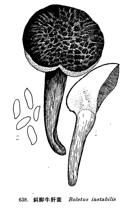 子实体较小。菌盖半球形,倾斜,赭土红褐色,直径6-7cm,表面稍光滑或常呈龟裂状,边缘有缺刻。菌肉白色,切伤部分粉红色,柄部菌肉则有褐色纤丝状条纹。菌柄极显著偏生至近侧生,长6-7cm,粗1.5-2.5cm。菌管长10mm,黄色,受伤处变蓝色,延生,管口直径0.5-1mm,近圆形,同菌管色。孢子橄榄色,椭圆形至近纺锤形,9-14μm×4-5μm,多为11μm×4.5μm。图例