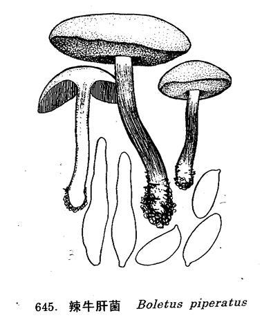 子实体中等大。菌盖直径3-9cm,扁半球形变至近扁平,幼时边缘内卷,表面稍干燥光滑或有时具鳞片,黄褐色或红褐色,中部色暗。菌肉稍厚,浅黄色,有辣味。菌管直生稍延生,黄色至赫黄色,变带红色,管口角形,黄色变红色至砖红色。菌柄近圆柱形,长3-12cm,粗0.3-1cm,黄色变红色至肉桂红色,基部黄色。孢子印褐红色。孢子光滑,长椭圆,带黄褐色,8.5-12μm×4-5μm。管侧囊体梭形,40-60μm×8-13μm。图例