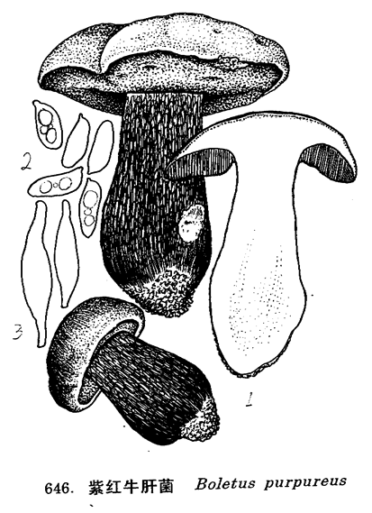子实体中等至较大,伤变蓝色。菌盖直径6-15cm,半球形至扁半球形,紫红色或小豆色,有时褪为浅茶褐色,表面具平伏绒毛往往裂成小斑,不粘。菌肉浅黄色,受伤处变蓝色,肉厚。菌柄近圆柱形,长5-10cm,粗1-4cm,黄色或部分呈紫红色,上部有紫红色网纹,基部膨大,内实。菌管黄色,凹生至近离生,受伤变蓝色。管口红色,后渐变为污黄或绿黄色,直径0.5-1mm。孢子近梭形至长椭圆形,淡黄色,光滑,9-12μm×4-5μm。管侧囊体梭形,35-60μm×10-12μm。图例