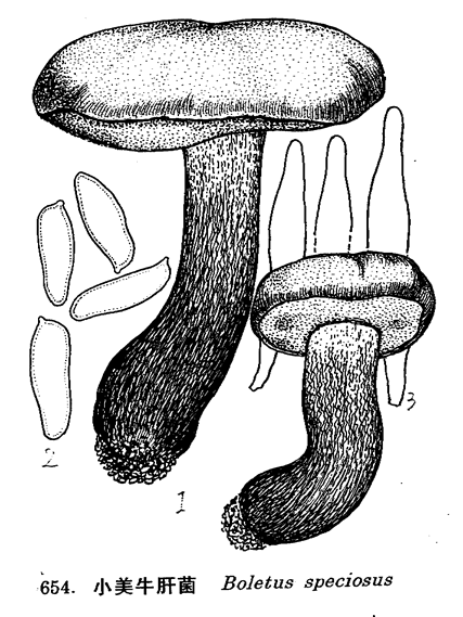 图 654 小美牛肝菌 : 1. 子实体, 2. 孢子, 3. 管侧囊体。