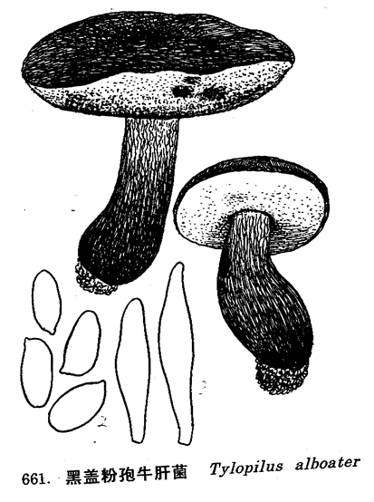 子实体中等至较大。菌盖直径3.5-12cm,扁半球形至平展,深灰色、暗青灰色或近黑色,具短绒毛。菌肉初期白色,后变淡粉紫色,最后近黑色。菌管直生或稍延生,初期白色,后呈淡紫褐色。管口同色,每毫米1-3个。柄长5.5-11cm,粗1.5-3cm,近圆柱形,下部稍膨大而色较深,上部色较浅并具网纹或全部具网纹,灰青色或近黑色,内实。孢子印淡粉褐色。孢子无色或近无色,长圆形、椭圆形或宽椭圆形,平滑,7.8-11.7μm×4-5μm。管缘囊体较多,长颈瓶状,淡褐色到褐色,一般26-47μm×10.4μm。图例