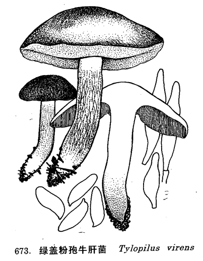 图 673 绿盖粉孢牛肝菌 : 1. 子实体, 2. 孢子, 3. 管缘囊体