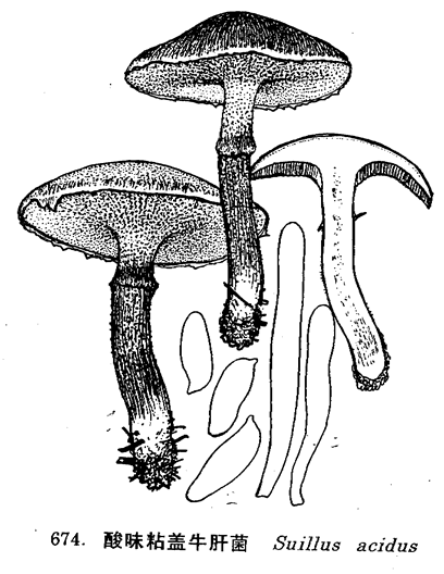子实体小至中等。菌盖直径3.5-10cm,半球形至扁半球形,有一层粘液,光滑,初期白色,很快变黄色至草黄色,老时浅粉褐色。菌肉浅黄白色,具酸味。菌管层柠檬黄色至赭黄色,菌管黄色,小。菌柄长4-10cm,粗0.5-1cm,近柱形,内实,初期近白色,后呈粉褐色或褐色,具有腺点。有菌环生柄上部。孢子印褐青色。孢子光滑,浅黄色至浅红褐色,近梭形,7.9-12μm×3.5-4.5μm。管缘囊体近柱状或棒状,黄褐色,25-60μm×4.5-8.4μm。图例