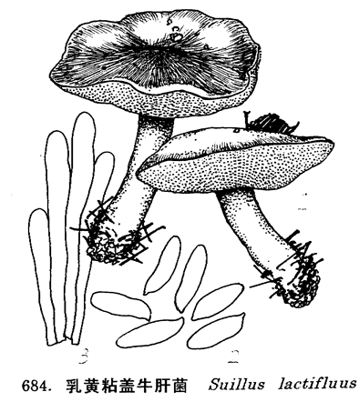 子实体小或中等。菌盖直径3-8cm,扁半球形至近平展,中部凸起,幼时近白色,淡黄色,渐变黄色至黄褐色,光滑,粘至很粘,盖边缘延伸,表皮可剥离。菌肉浅黄色,盖中部厚而靠边缘薄,伤时不变色或较长时间后变浅褐色,无明显气味。菌管初期乳白色至乳黄色,后期变黄褐色。管长6mm左右,在菌柄上稍延生,易剥离,伤处不变色。菌孔圆形或近角形,每毫米2-4个。管孔口在初期有乳白色汁液滴,干后成污色颗粒或黑褐色小腺点。菌柄中生或稍偏生,近圆柱形,长2-5cm,粗0.5-1cm,内部实,表面乳黄色至黄褐色,似有绒毛。孢子印褐色。孢子光滑,淡褐色,长椭圆形,7-10.2(12)μm×3-4.5(5)μm,含有小油球。管缘囊体多丛生,棒状,带黄色,33-19μm×4-7.5μm。