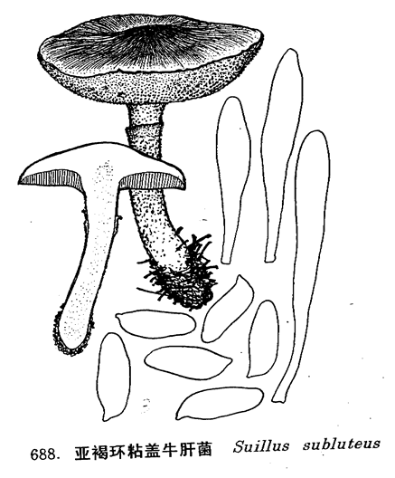 子实体小或中等大。菌盖直径2.5-6(10)cm,中部凸起至扁平,湿时很粘,污黄色至黄色或土黄色。菌肉淡白色至淡黄色。菌管近延生,黄色或淡黄褐色。管口复式,有腺点,有时近辐射状排列,每毫米1.5-2个。菌柄长4-8cm,粗0.9-1.2cm,上下同粗或下部稍粗,白色或淡黄褐色,菌环膜质,位于柄之上部,菌环以上无网纹,上部或全部有腺点,内实或稍空。孢子印锈褐色至黄褐色。孢子带淡黄色,长椭圆形或椭圆形,7-10.4μm×3-4μm。管缘囊体无色至淡褐色,棒状或圆柱形,顶端钝,33-50μm×6-10μm。生态习生: 秋季于杂木林中地上单生或散生。图例