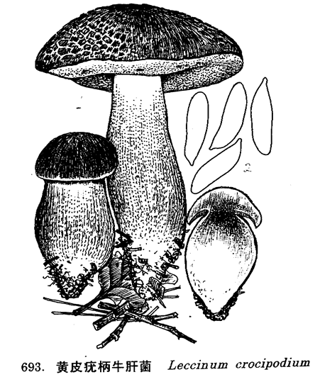 图 693 黄皮疣柄牛肝菌 : 1. 子实体, 2. 孢子