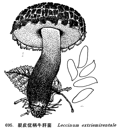 图 695 裂皮疣柄牛肝菌 : 1. 子实体, 2. 孢子
