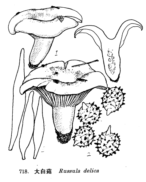 图 718 大白菇 : 1. 子实体, 2. 孢子, 3. 褶侧囊体