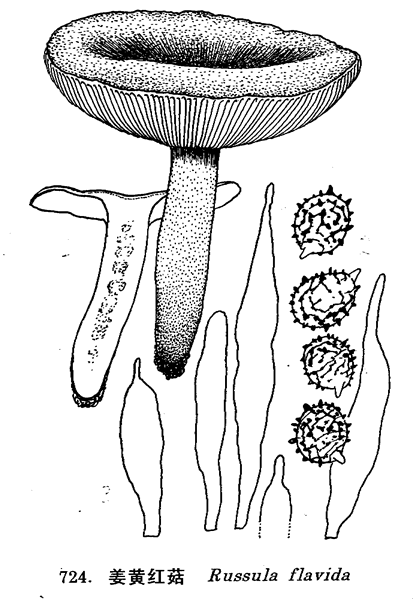 子实体一般中等大。菌盖直径3-8cm,初期扁半球形,中部下凹,后呈漏斗状,表面呈鲜亮的金黄色或姜黄色,粘,渐呈现粗糙似粉状,边缘无条纹或有条棱。菌肉白色,麻辣及不愉快之气味。菌褶直生至近离生,污白色,等长,密至稀。褶间有横脉或分叉。菌柄一般呈粗圆柱状,基部细或变粗,长3-8cm,粗0.8-2.3cm,表面粗糙而往往有纵的条沟窝,较盖面色深呈老金黄色或深姜黄色,内部松软。孢子近球形,有刺棱及网纹,7.5-9.5μm×6-8μm。褶侧或褶缘囊体近棱形或近棒状,顶端尖细,3.5-5.5μm×6-8μm。图例