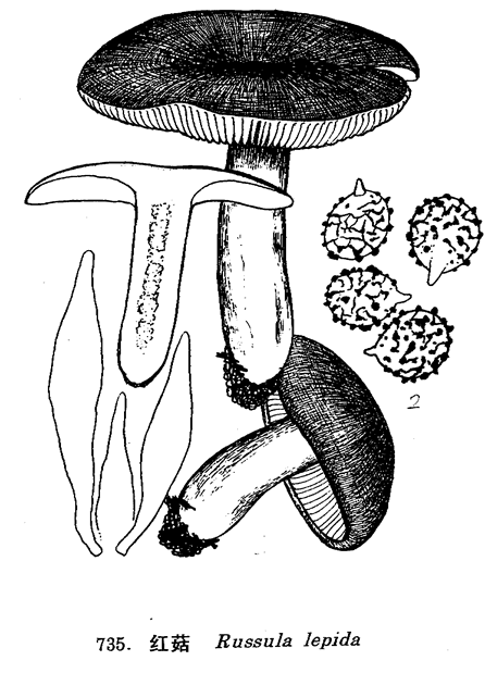 图 735 红菇 : 1. 子实体, 2. 孢子, 3. 褶侧囊体