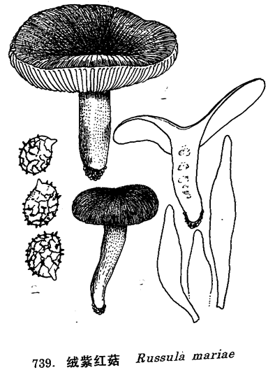 子实体中等大。菌盖直径3.5-9cm,扁半球形,后平展至中部下凹,不粘,玫瑰红或玫瑰紫红色,中部色较深,有微细绒毛,边缘幼时内卷,老后有不明显条纹。菌肉白色,有时表皮下为淡红色,中部厚,边缘薄。味道柔和无气味。菌褶白色,后污乳黄色,稍密,等长,基部分叉,有横脉,直生或稍下延。菌柄长2.5-5cm,粗1-2cm,粉红至暗淡紫红色,有的基部白色,中实后松软,近圆柱形或向下渐细。孢子印淡乳黄色。孢子无色,球形或近球形,有小刺和网纹,7-9.1μm×7-7.6μm。褶侧囊体多,近梭形,60-127μm×7.5-13μm。图例