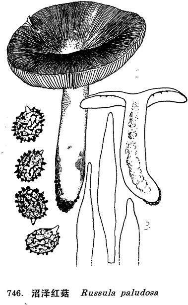 子实体中等大。菌盖宽5-11cm,初扁半球形,后平展并下凹,红色或橘红色,很少褪色,中部淡红黄色,边缘平滑,老后有短条纹。菌肉白色,表皮下稍带淡红色。味道柔和,或稍辛辣,气味不显著。菌褶白色,后乳黄色,等长,直生,褶间有横脉,很密,常有分叉,褶边缘常带红色。菌柄长6-14cm,粗2-3cm,白色,有时带粉红色,中实后松软最后中空,近圆柱形或向上略细。孢子印深乳黄色。孢子近球形,有小刺可相联成脊或近网状,8-10μm×7.3-9μm。褶侧囊体近梭形,6.5-101μm×9-14.5μm。图例