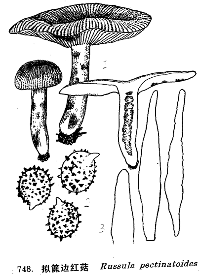 子实体小至中等大。菌盖直径3-6cm,初期扁半球形,后平展中部下凹呈浅漏斗状,表面湿时粘,平滑无鳞片,浅褐黄色或暗茶褐色,中央色深,干后表面全为暗茶褐色,边缘有明显的由小疣组成的条棱。菌肉白色,中部稍厚而靠边缘甚薄。菌褶白色,伤处久后变浅锈褐色,直生,稍密或稍稀,等长或很少有短菌褶,有分叉,褶间具横脉。菌柄圆柱状,稍弯曲,白色或浅灰褐色,长3-6cm,粗0.4-1.4cm,表面平滑,内部松软至空心。孢子印污白色。孢子无色,近球形,有小刺,6-8μm。褶侧囊体近梭形至近棒状,55-60μm×7-11μm。图例