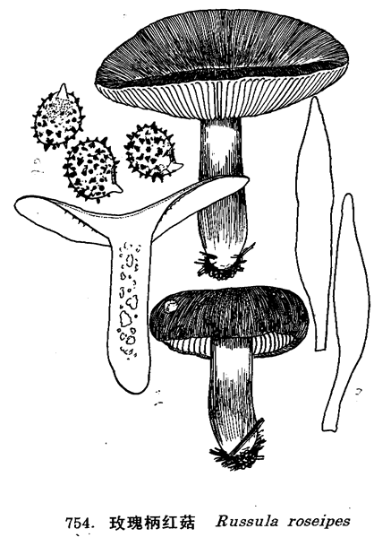 子实体一般中等大。菌盖凸形至平展中凹形,直径6.5-10.5cm,红色,湿时粘,有时被白粉末,偶有表皮开裂,肉质,盖缘整齐,延伸,菌肉白色,伤后不变色,近柄处厚4.5mm,或更厚,无味或无明显气味,气味无至怡人。菌褶淡黄色,直生,等长,盖缘处每厘米7至12片,宽6-10mm,具横脉,褶缘平滑。菌柄中生,海绵质,实心至中空,白带点苋菜红色,圆柱状,长4-6cm,近柄顶部粗12-15mm,无附属物。孢子近球形,6-10.5μm×5.5-9μm,有钝小刺,黄色。担子棍棒状,35-45(50)μm×10-13μm,四孢,小梗长2-4μm,淡黄色。侧生囊体散生,近梭状至披针形,40-100μm×6-13μm,近无色至浅黄色。图例