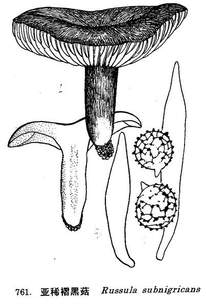 图 761 亚稀褶黑菇 : 1. 子实体, 2. 孢子, 3. 褶侧和褶缘囊体